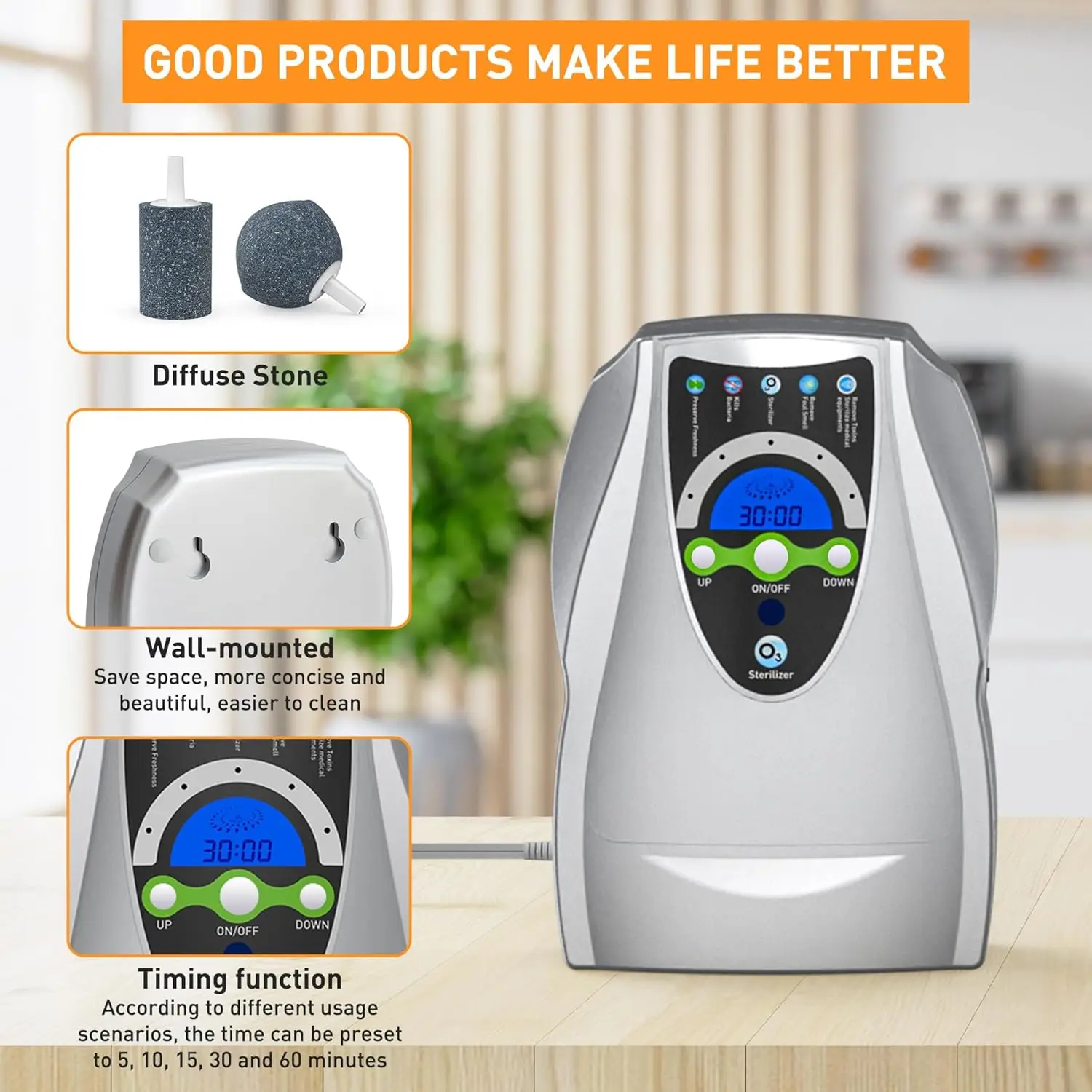 Discover the versatile ozone generator designed to enhance cleanliness and freshness in your daily life. This compact device offers powerful features to meet various needs. Key Features: – High-Efficiency Ozone Production: Generates up to 500mg of ozone per hour, effectively purifying water and air. Use it for cleaning meat, seafood, fruits, vegetables, tableware, and even facial care to ensure hygiene and safety. – Odor Elimination: Leveraging the strong oxidizing properties of ozone, this machine decomposes unwanted odors in the air. Ideal for freshening up kitchens, bathrooms, or any space requiring odor removal, providing a clean and pleasant environment. – Compact and Portable Design: With a wall-mounted option to save space and easy installation, this lightweight unit is highly portable. Move it effortlessly between rooms or locations as needed for convenient use. – Timer Functionality: Equipped with a 5-speed timer (5, 10, 15, 30, and 60 minutes), you can preset operation times based on different scenarios. The large screen clearly displays the working status for easy monitoring. – Eco-Friendly Operation: Uses natural air as raw material; ozone naturally reduces to oxygen within 30-60 minutes after use without causing secondary pollution. Enjoy peace of mind with this environmentally conscious choice. – Included Accessories: Comes with a silicone tube and two diffusion stones that produce abundant bubbles to enhance ozone solubility in water for more effective purification. This ozone generator is perfect for home kitchens where food preparation demands cleanliness or offices seeking improved air quality. Its multifunctional capabilities make it suitable for diverse settings like small businesses or personal spaces needing reliable purification solutions.
